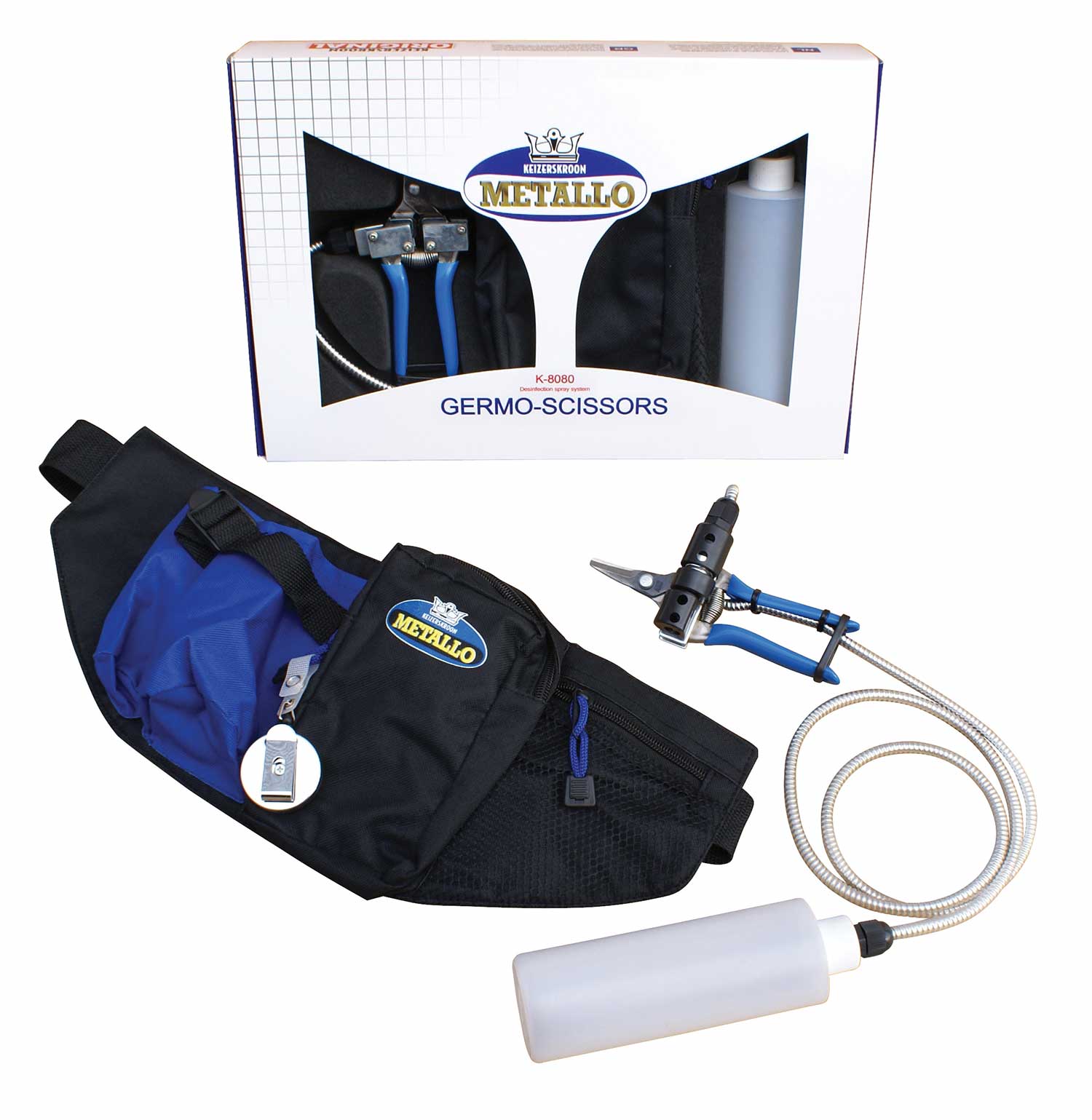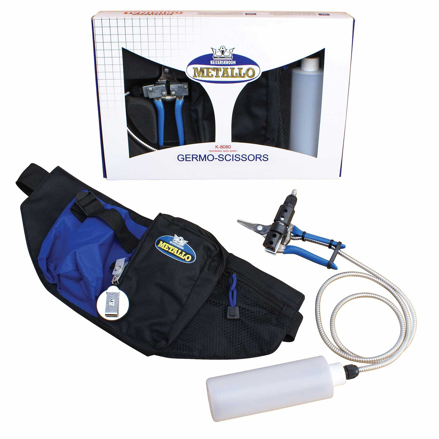 Metallo Self Disinfecting Germo Pruner kit. ARS pruner, with solution bottle, carry pouch, and sprayer mechanism. Max cutting diameter .5″ Kit contains ARS pruner, solution bottle, carry pouch, and sprayer mechanism.