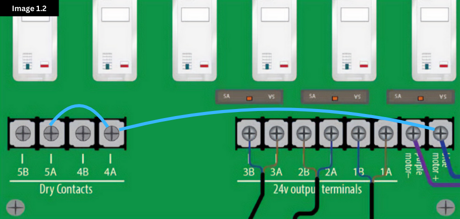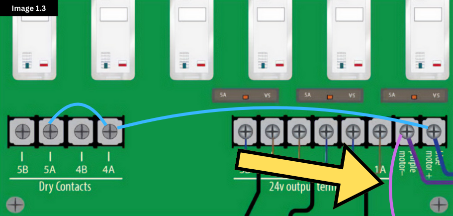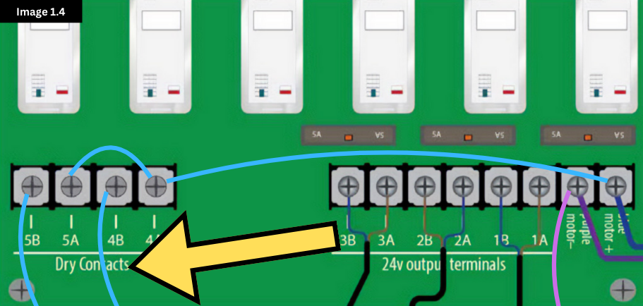 Run a wire from the “blue motor +” terminal to 4A and 5A, respectively (see Image 1.2 below). Contacts 4B and 5B are now no longer “dry” contacts. When the relay above the contacts engages, 24V DC will be present on 4B and 5B. (Note: 24 VDC will only show on a multimeter if the other prong of the multimeter is touching the terminal with the purple wire.)