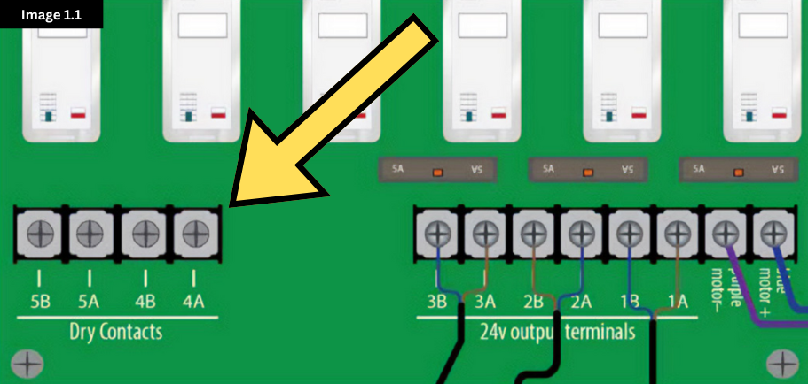 Locate the dry contact terminals on your AegisTec controller. These terminals are labeled 4A, 4B, 5A, and 5B. In this article, we will assume that we are turning both 4A/4B and 5A/5B into signal contacts. See Image 1.1.